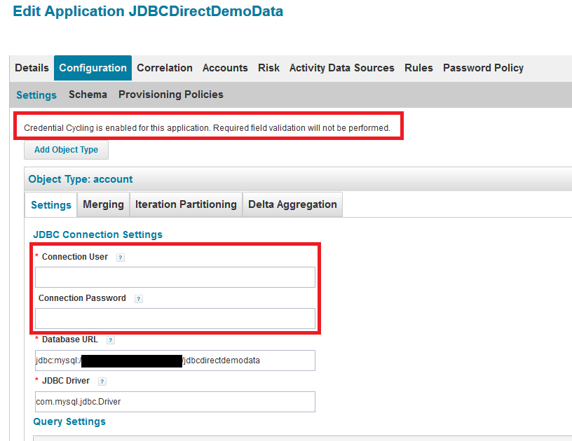 Here is how credential cycling, as configured using the template above, will appear in IdentityIQ in the JDBCDirectDemoData application. The message indicates that the Connection User and Connection Password, which are marked with asterisks indicating that they are required, do not need to be supplied here because they will be provided through credential cycling.